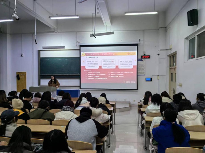 随后,王亚杰针对学院资助政策为新生们进行讲解,分别从国家奖学金、国家励志奖学金的评选办法,先进个人和先进集体具体分类及评选条件、流程,综合素质测评细则三方面展开,详细地讲述了与学生息息相关的评奖、评优政策。她表示,获得奖项、荣誉的过程不是一蹴而就的,是通过每一个人脚踏实地、奋力拼搏而水到渠成的,祝愿所有学生四年之后都能成为那个“闪闪发光的自己”。