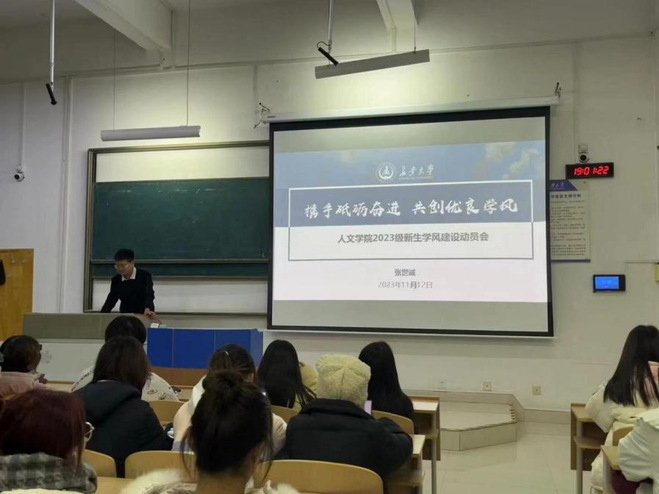 为学习贯彻落实习近平新时代中国特色社会主义思想,落实“立德树人”根本任务,培养德智体美劳全面发展的社会主义建设者和接班人,11月13日晚,人文学院2023级“携手砥砺奋进,共创优良学风”学风建设教育讲座在鸿远教学楼1101开展。学院辅导员张世诚、王亚杰及2023级全体本科生参加本次活动。