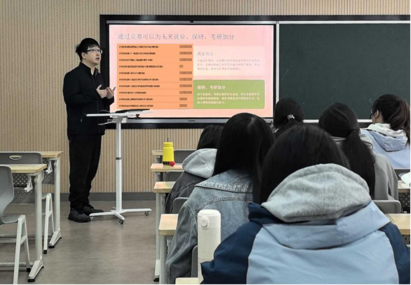 随后,高超老师结合近期校内外竞赛的通知,重点介绍了几项适合公共事业管理专业学生参与的赛事,包括第二十一届全国大学生文学作品大赛、长安大学首届人工智能创新大赛、第十届华为ICT大赛、第十六届全国大学生市场调查与分析大赛以及第十二届全国大学生能源经济学术创意大赛等。他详细讲解了每项竞赛的核心内容与参赛方向,鼓励同学们结合自身兴趣与专业特长积极报名参与。
