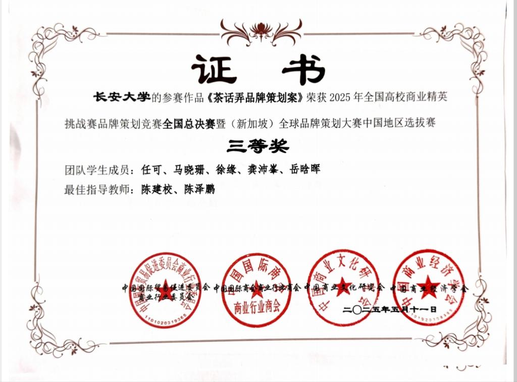 近日,2025年全国高校商业精英挑战赛品牌策划竞赛全国总决赛比赛结果揭晓,由长安大学人文学院陈泽鹏老师参与指导,人文学院研究生任可、马晓珊、徐缘、龚沛峯、岳晗晖共同参赛的作品《闲情自在茶话弄》荣获国家三等奖。