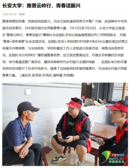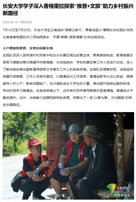 中国青年网:《长安大学学子深入香格里拉探索“推普+文旅”助力乡村振兴新路径》