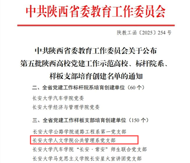 近日,陕西省委教育工委正式公布第五批陕西高校党建工作示范高校、标杆院系、样板支部培育创建名单,人文学院公共管理系党支部成功入选“全省党建工作样板支部”培育创建单位。