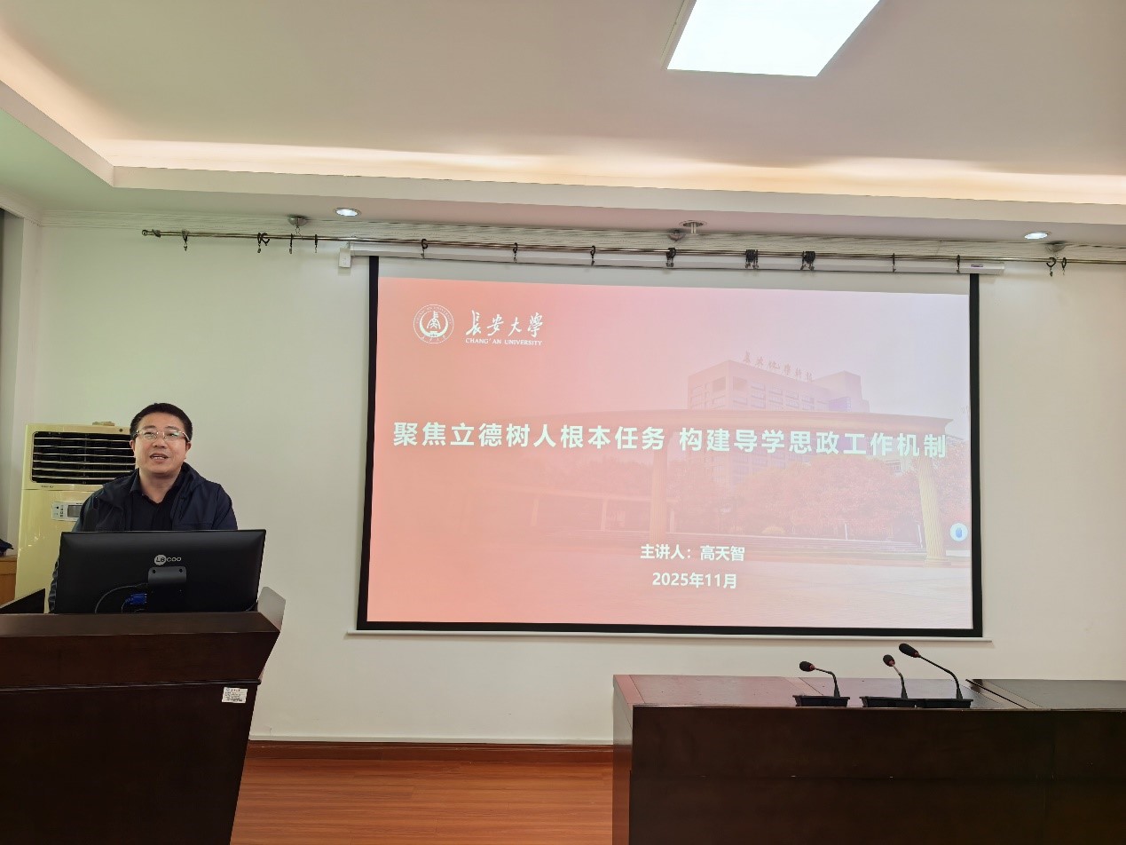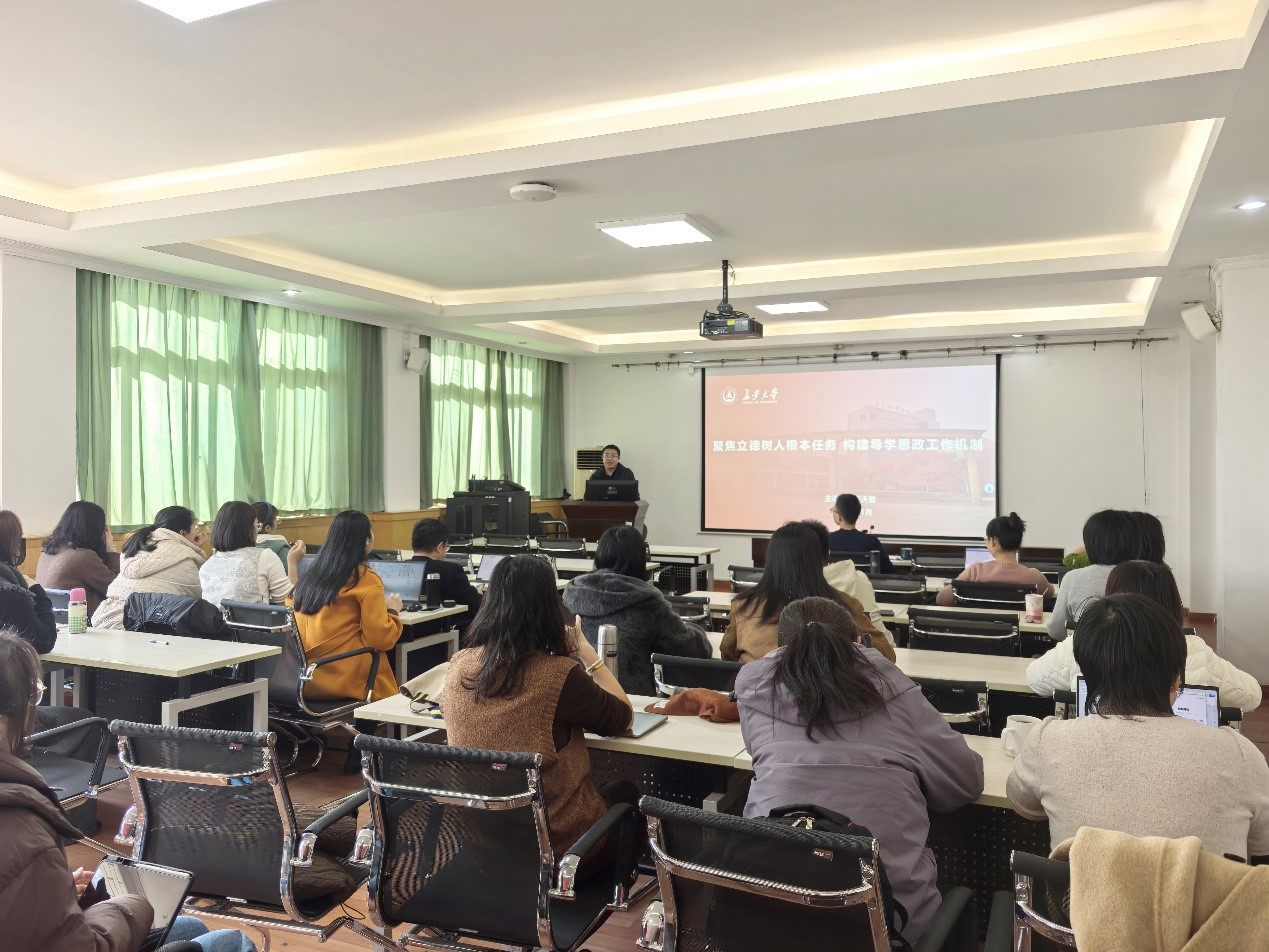 2025年11月19日,人文学院特邀研究生工作部部长高天智开展研究生指导教师培训,培训主题为“聚焦立德树人根本任务,构建导学思政工作机制”。人文学院全体研究生导师参加此次培训会,会议由副院长杜波主持。