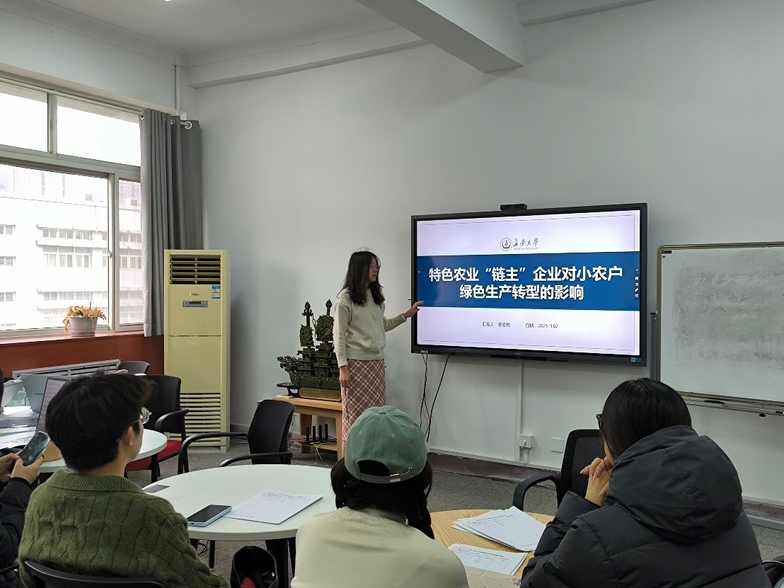 相苏艳从研究背景和研究意义入手,向在场的老师和同学介绍了研究结果。她围绕辐射效应理论,详细介绍了特色农业“链主”企业带动小农户绿色生产转型的理论框架。基于陕甘宁三省重点帮扶县1445户小农户的调研数据,相苏艳运用内生转换模型,构建反事实框架,深入分析了“链主”企业带动小农户绿色生产转型的影响效应。