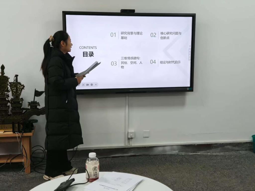 陶润福首先点明情感表达在人类艺术创作中的核心价值并引出“声音景观”这一核心理论视角。她详细阐释了加拿大作曲家谢弗的声景理论内涵,并通过米歇尔·希翁的“增值”理论,论证了声音并非影像的从属,而是具备独立表情达意功能的艺术载体。随后,她指出过往西部电影声音研究存在的局限并提出本研究以“声音景观的整体性系统建构”与“情感主动性介入”为核心视角。在核心内容分享环节,陶润福从三维情感维度展开论述,通过在民俗-空间-人物三者的互动关系得出情感对于声音景观的建构作用。最后,她强调在AI技术主导影像生成的当下,坚守“民俗—空间—人物”三维情感的系统性关联,是西部电影声景创作保持独特性与生命力的关键。