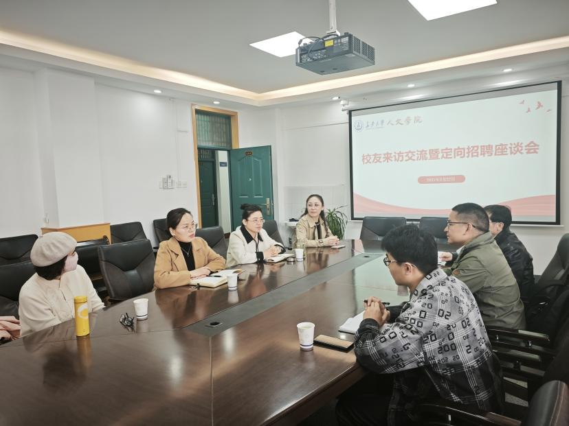 何红娟对曾乐乐的来访表示欢迎,同时与其就校友平台建设、院企合作、就业高质量发展等问题进行亲切交流。她指出,人文学院始终秉承“厚植人文底蕴、服务社会发展”的办学宗旨,紧密围绕国家文化强国战略和区域经济社会发展需求,着力构建“政产学研用”一体化育人体系。她强调,学院近年来持续深化院企协同育人机制,建立了“企业需求库”和“毕业生能力画像”动态匹配平台,针对重点企业实施“一企一策”定制化招聘服务,实现人才培养供给侧与产业需求侧精准对接。她表示,本次座谈会是学院与校友企业进一步深化合作的宝贵契机,希望未来能够多与校友单位互助互通,在毕业生实习、就业招聘等工作上开展更深入合作,借以建立良好的产教融合模式,为学院人才培养搭建更广阔的实践平台,与校友单位共谋发展。